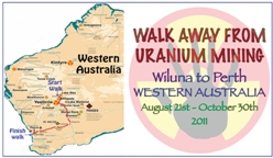 Walk away from Uranium Mining will be a 10-week walk from the proposed uranium mine sites located in the Wiluna area of Western Australia. The walk will bring together people from around the world to walk the land and hear directly from the Aboriginal communities being threatened by these proposed mines. It will form international alliances with Native American people and activists from France, Italy, Greece, Germany, Japan, New Zealand and the U.S as we walk together and learn first hand about the reality and human rights abuses perpetuated by the uranium mining industry.