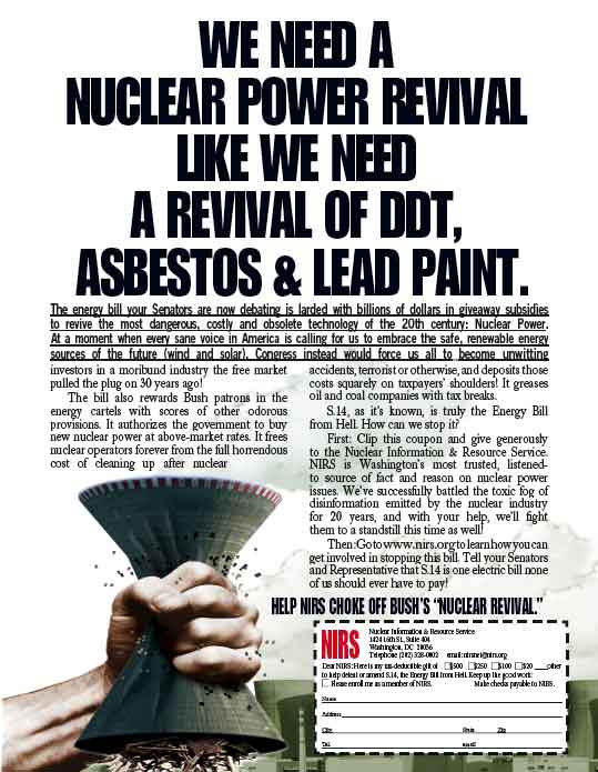 View NIRS' ad in the June 23, 2003 Nation opposing the energy bill.