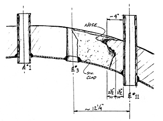 A diagram showing the extent of severe corrosion through the entire reactor pressure vessel outer wall (nearly 7 inches) with only the stainless steel inner liner (3/16 of an inch in some places) remaining. The inner liner was bulging out into cavity and cracking from extreme operational pressure of the reactor.