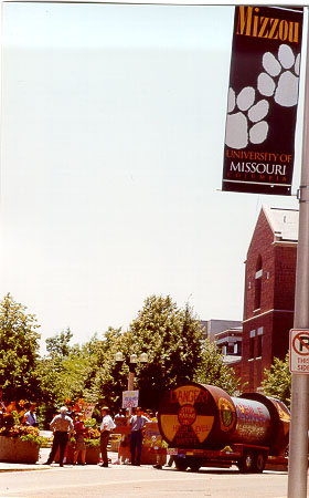 "Columbia" shows cask pulling into U. of MO in Columbia. Columbia lies directly off I-70, which could see 2 truck shipments of high level waste per day for 30 years. Note the columns and dome of Jesse Hall, symbol of U. of MO and Columbia for that matter. |