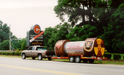 "MI and DC Cook" and show the cask in front of the main entrance and propaganda billboard to the Cook nuclear power complex in southwest Michigan. Cook is one of the main targets of the Nuclear Free Great Lakes Action Camp, which will be in southwest Michigan from August 20-28, 2000. |