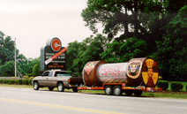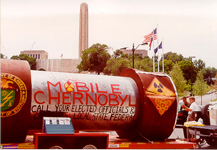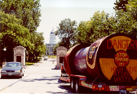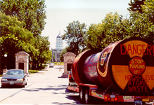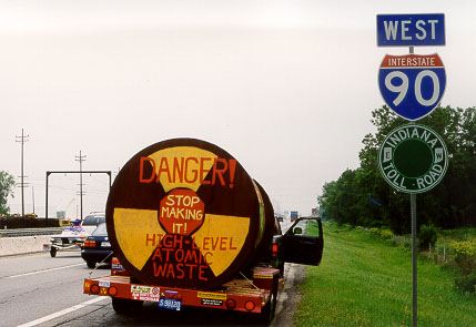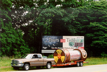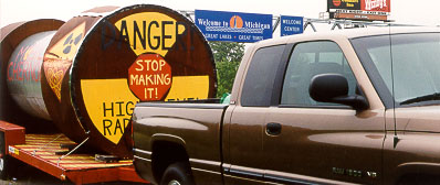 "Michigan" shows the mock waste cask leaving Michigan, an image Rep. Fred Upton (R-Mich., sponsor of the House Mobile Chernobyl bill) dreams about at night. |