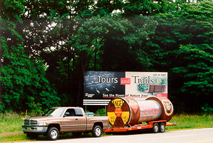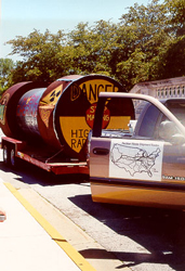 The cask in Michigan, ready to roll. The poster on the truck door shows likely radioactive waste transport routes. |