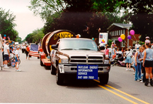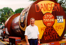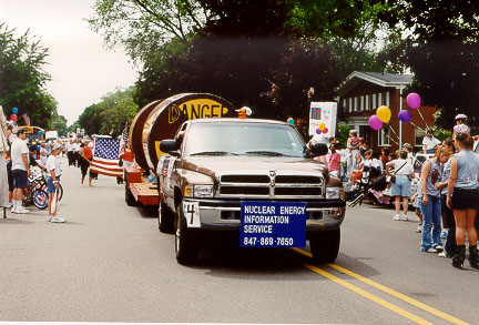 shows the deciding vote caster enjoying our cask at the Evanston 4th of July parade. He also liked the info sheets we were handing out that day, with the bold banner headline "Durbin Was Right!" for his vote on S. 1287. Durbin (D-Ill.) cast a key vote to sustain President Clinton's veto of the Mobile Chernobyl bill earlier this year. |