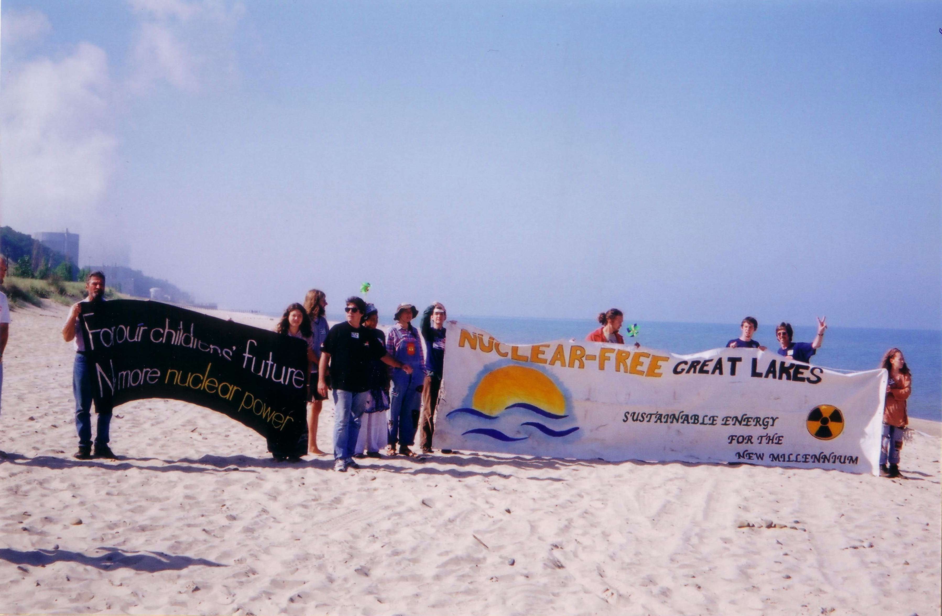 Participants in the August 2000 Nuclear-Free Great Lakes Action Camp hold banners on thebeach at Van Buren State Park on the Lake Michigan shoreline in southwest Michigan. The Palisades containment dome, steam rising from the mechanical draft cooling towers, and Lake Michigan itself are visible in the background. The left-hand banner reads "For our children's future, No more nuclear power." The right-hand banner reads "Nuclear-Free Great Lakes: Sustainable Energy for the New Millenium.