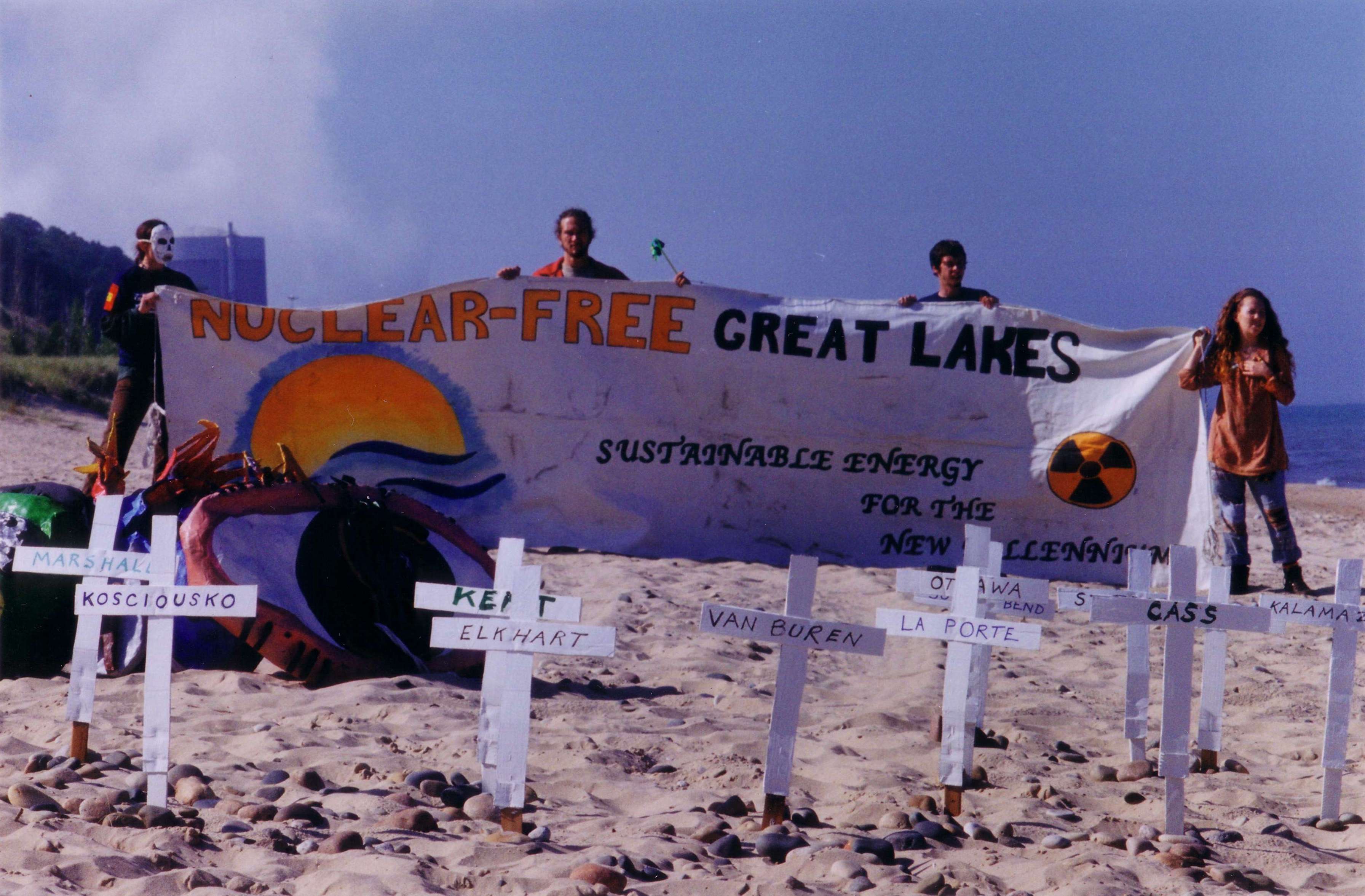 Participants in the August 2000 Action Camp hold a "Nuclear-Free Great Lakes: Sustainable Energy for the New Millenium" banner in Van Buren State Park in southwest Michigan, with Lake Michigan, the Palisades nuclear plant containment dome, and steam rising from the mechanical draft cooling towers visible in the background. In the foreground, along with street theater costumes such as "Seeing Dollars Signs" (an eyeball with a dollar sign, representing the greed of the nuclear industry which throws caution to the wind), white crosses bear the names of communities in Michigan, Indiana, and Illinois that could be devastated from a large-scale radiation release from Palisades.