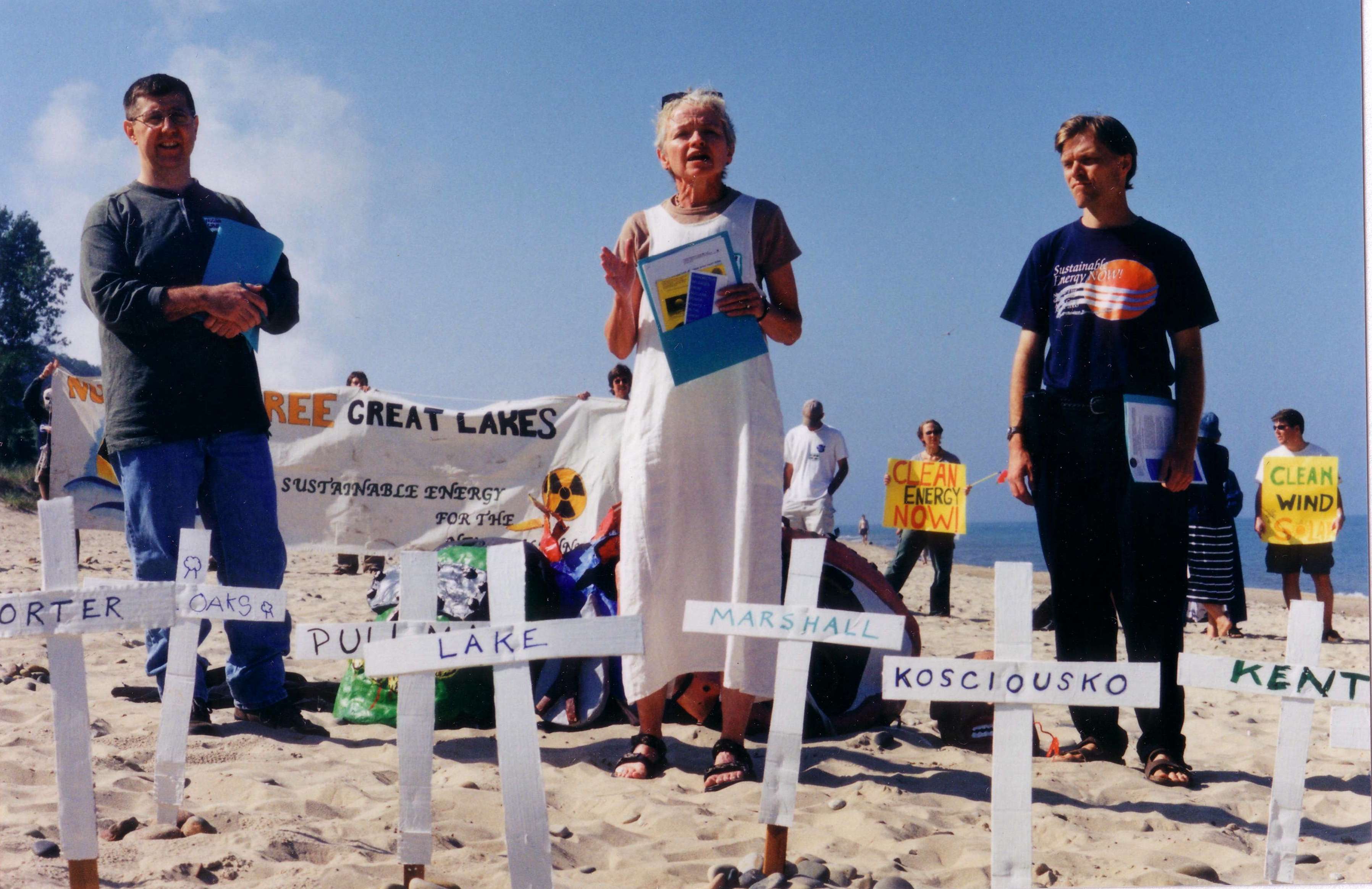 Alice Hirt of Don't Waste Michigan speaks to participants of the August, 2000 Nuclear-Free Great Lakes Action Camp on the Lake Michigan shoreline at Van Buren State Park in soutwest Michigan. She is flanked by Michael Keegan of the Coalition for a Nuclear-Free Great Lakes and Kevin Kamps of NIRS. The lake is visible in the background, as is the steam rising from Palisades' mechanical draft cooling towers. In the foreground, white crosses represent communities in Michigan, Indiana and Illinois that coould be devastated -- depending on wind direction and the flow of Lake Michigan -- from a large radioactivity release from Palisades.