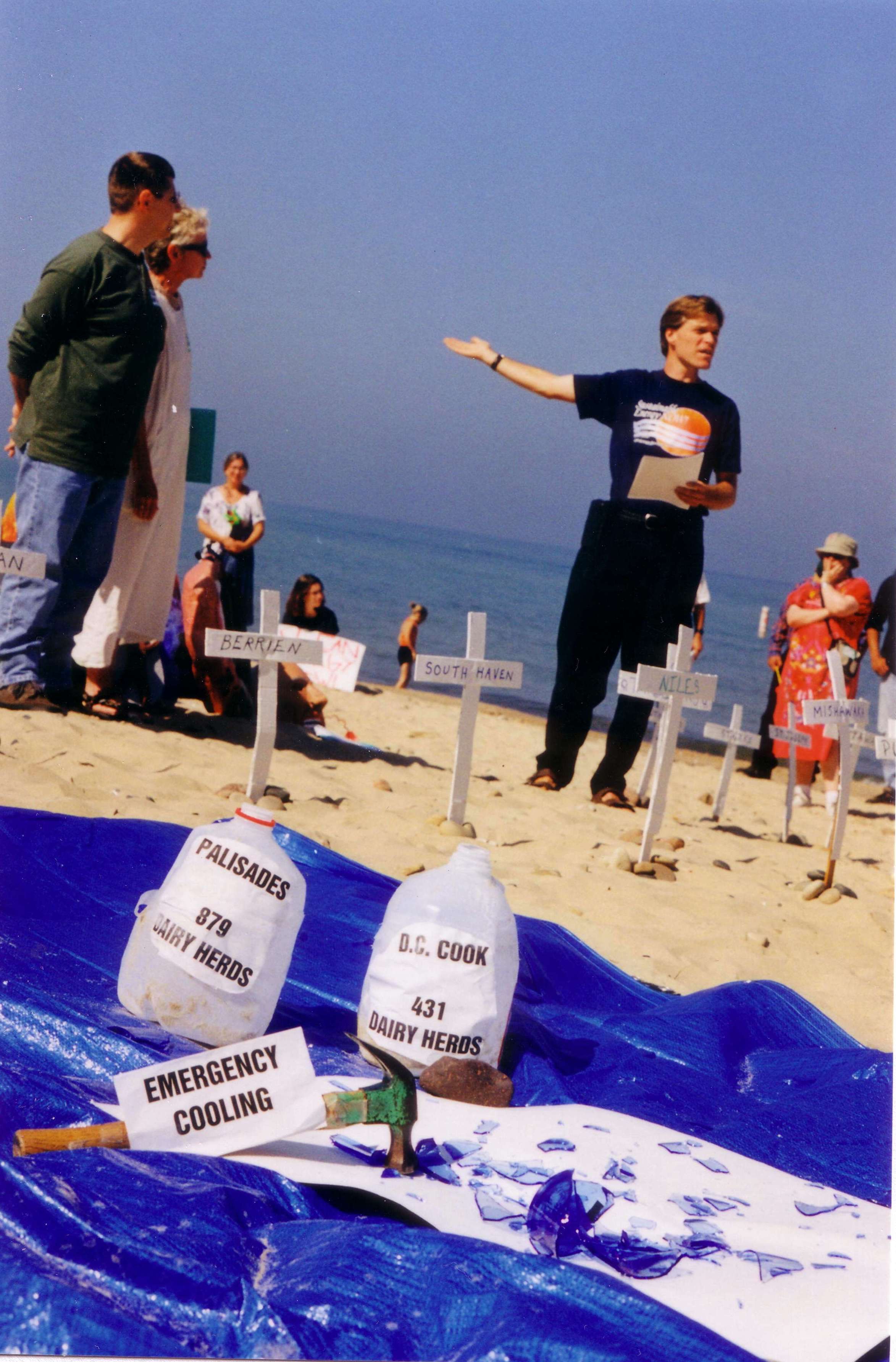 Kevin Kamps of NIRS explains to participants of the August 2000 Nuclear-Free Great Lakes Action Camp that due to its highly embrittled reactor pressure vessel, the emergency core cooling system at Palisades could actually cause a pressurized thermal shock to the metal, causing it to fracture like a hot glass under cold water. A large-scale radiation release would, among many other things, result in the destruction of milk from 879 surrounding dairy herds, according to official State of Michigan radiological emergency plans. Similarly, a severe radiation release from the Cook nuclear power plant just 30 miles south of Palisades would result in the ruin of 431 dairy herds. The hammer, shattered glass vessel, and empty milk jugs on the beach at Van Buren State Park -- immediately adjacent to Palisades on the Lake Michigan shoreline -- symbolize these points. Dozens of white crosses represent the communities in Michigan, Indiana and Illinois that could be wiped out by a major accident or attack at Palisades.